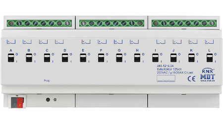 Привод MDT Switch Actuator принимает телеграммы KNX / EIB и переключает до 12 независимых электрических нагрузок. Каждый выход использует бистабильное реле с механическим ручным управлением для прямого срабатывания контакта реле.