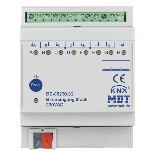 Двоичный вход MDT доступен в 3 версиях: обнаружение входа сигналов 24 В переменного / постоянного тока, обнаружение входа сигналов 230 В переменного тока и входы для беспотенциальных контактов. Двоичный вход реагирует в зависимости от своих запрограммированных параметров и отправляет телеграмму по шине KNX.