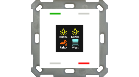 Выключатель KNX Smart 55 4-кнопочный с сенсорным экраном, термодатчик, короткое/долгое/очень долгое нажатие, функции переключение/диммиование./жалюзи/сцена/значение, LED индикация (RGBW), 4 блока лог. функций, в рамку 55x55 мм, белый глянцевый