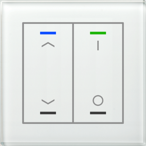 Выключатель сенсорный KNX Glass Push Button II Lite 2-кнопочный, c символами I/O и ↑/↓, термодатчик, короткое/долгое/очень долгое нажатие, функции переключение/диммир./жалюзи/сцена/значение, LED индикация RGBW, лог. функции, 92x92 мм, стекло
