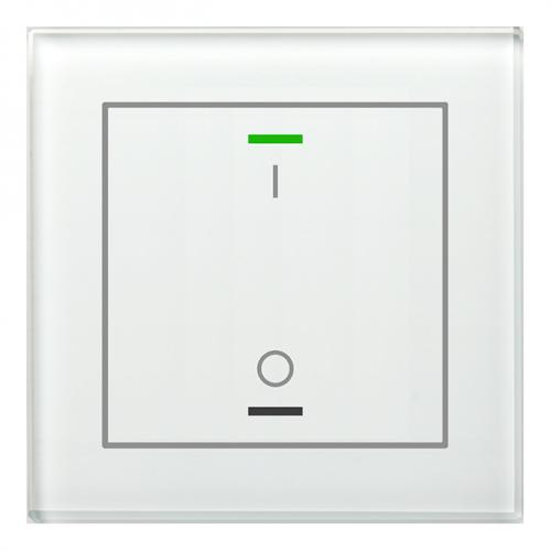 Многофункциональный выключатель с RGBW индикацией состояний, встроенный датчик температуры, символы ВКЛ / ВЫКЛ, материал: белое стекло / белый пластик, шина KNX.