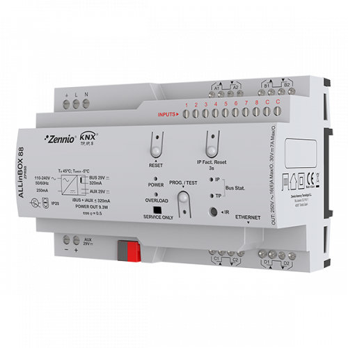 Многофункциональное устройство Zennio ZPR88 ALLinBOX 88, объединяющее всё необходимое для мониторинга и управления, на DIN-рейку (8 ТЕ). Включает в себя источник питания KNX 320 мА, KNX-IP интерфейс, контроллер климата с 4 независимыми термостатами, логический модуль и многофункциональный актуатор с 8 входами и 8 выходами (емкостные нагрузки), с широкими возможностями конфигурирования: управления жалюзи, индивидуальные выходы или управление фанкойлом.