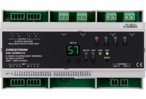 4х канальный диммер Crestron DIN-4DIMFLV4, предназначен для установки в стандартные модульные электрические шкафы с направляющей DIN рейкой. Диммер Crestron DIN-4DIMFLV4 служит для плавного регулирования световой нагрузки, пускорегулирующими аппаратами люминесцентных ламп с регулируемым напряжением 0-10 В.