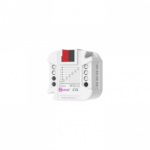 Модуль дискретных входов/выходов UCS-06.06 предназначен для преобразования входного воздействия (кнопка, выключатель, реле, выход датчика и т.п.) в управляющие телеграммы шины KNX, а также для отображения состояния телеграмм при помощи маломощного индикатора (например, светодиода).