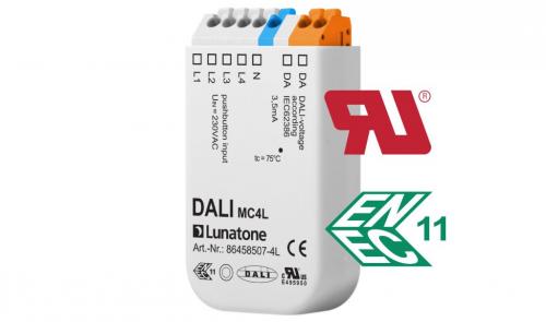 DALI MC4LInterface с 4, от шины DALI гальванически изолированными, входами для сетевого напряжения. Входы могут быть индивидуально сконфигурированы с целевым адресом, поведением кнопок и командами DALI. Помимо стандартных функций, затемнения, переключения, вызова сцены и т. Д., Также поддерживаются предопределенные макросы, такие как настройка цветовой температуры, динамические сцены и секвенсор, а также пользовательские списки команд. Устройство предназначено для установки за выключателем света в коробке с промывкой.