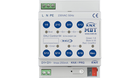 Шлюз MDT DaliControl Gateway представляет собой интерфейс между источниками света DALI и установкой KNX и предлагает множество новых возможностей, таких как управление освещением в цветовом пространстве HSV.