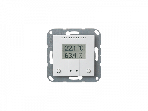 Встроенный дисплей показывает собственное значение, а также данные, полученные по шине (например, дату, время суток). Корпус дополнен рамкой той серии выключателей, которая используется в зданиях, благодаря чему органично вписывается во внутреннюю отделку.