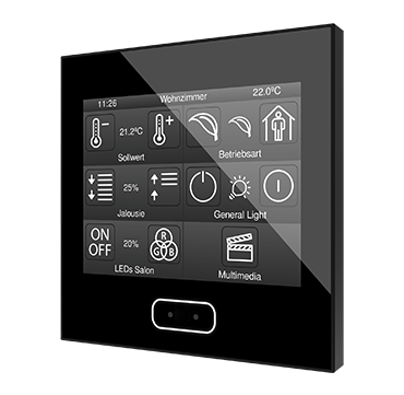Емкостная сенсорная панель с подсветкой 3,5" дисплея, датчиком приближения, внутренним датчиком температуры и двумя независимыми термостатами. 56 контрольных точек/кнопок, разделенных на 7 страниц. Встроенный датчик приближения позволяет отображать заставку (изображение, время, дату и/или температуру), когда сенсорная панель не используется, а датчик яркости автоматически регулирует яркость. В комплект входят 4 аналого-цифровых входа, которые могут быть сконфигурированы как двоичные входы, датчики, кнопки, датчики температуры или детекторы движения.