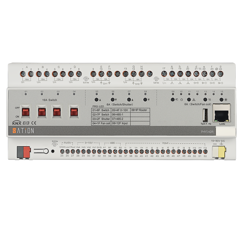 15-кратное реле может быть динамически сконфигурировано с функциями переключателя, затвора и фанкойла, 4-кратной функцией затемнения 0 В ~ 10 В, 12-кратной функцией ввода-вывода; Встроенный интерфейс Ethernet, интерфейс шины KNX, интерфейс шины RS485.