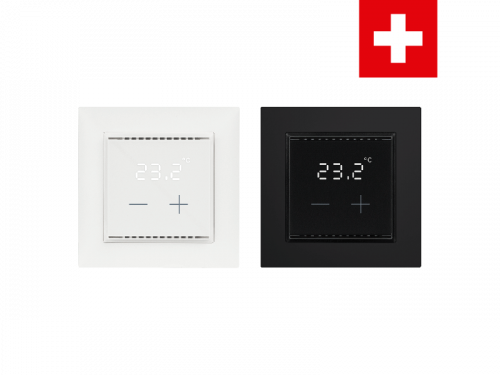 Cala KNX T 101 CH имеет встроенный ПИ-регулятор для отопления и система охлаждения (одно- или двухступенчатая). Температура в помещении регулируется с помощью сенсорных кнопок «+» и «-».