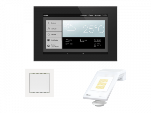 WS1000 Connect поставляется в виде набора, в который входят датчики, необходимые для данных о климате в помещении и данных о погоде, а также центральный блок (дисплей с управляющей электроникой). Значения датчика отображаются на дисплее и являются основой автоматического управления.