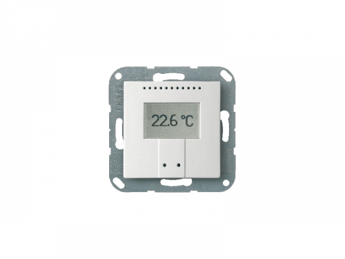 Встроенный дисплей показывает собственное значение, а также данные, полученные через шину (например, дату, время суток). Корпус дополнен рамкой серии выключателей, используемых в зданиях, благодаря чему органично вписывается во внутреннюю отделку.