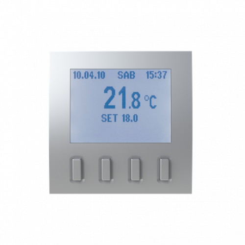 Стандартный термостат KNX оснащен ЖК-дисплеем с подсветкой. 4 кнопки на передней панели для следующих функций (переключение режима работы, ручное переключение скорости фанкойла, ручное увеличение/уменьшение заданного значения). Возможность выбора другого типа управления: 2-точечное ВКЛ/ВЫКЛ, ШИМ, Продолжение, Фанкойл