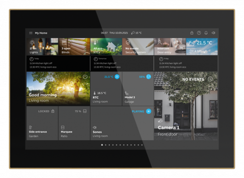 Свободно программируемая сенсорная панель с 10-дюймовым IPS-экраном с разрешением 1280*800, которая сочетает в себе автоматизацию умного дома и дверную связь в одном устройстве для жилых помещений, гостиниц и коммерческих зданий. SmartTouch 10 предлагает управление домом и мониторинг системы free@home или KNX, а также полностью интегрированные функции ABB Welcome®. Контролируйте, наблюдайте и управляйте всей вашей установкой на одном устройстве: переключение — затемнение — слайдер — шторка — элемент управления RGBW — пошаговый переключатель — переключатель сцены — элемент дисплея — элемент управления звуком. С функцией сцены, логическими функциями, симуляцией присутствия и временными программами. SmartTouch® 10” также можно использовать в качестве оконечного устройства для связи с вызывными станциями ABB-Welcome и в составе домофонной системы ABB-Welcome. Функции KNX: • В общей сложности 450 элементов управления отображаются максимум на 25 страницах. • 80 сообщений об ошибках и тревогах • 30 логических функций • 40 таймеров • имитация присутствия для 20 участников • 10 активаторов сцен • 3 объекта RTC • Оснащен слуховой петлей для передачи аудиосигнала в слуховые аппараты • Отображение страницы с максимум 18 касаниями поверхности на одной странице free@home: • Соединение по витой паре обеспечивает на одной странице до 18 элементов управления. • В качестве альтернативы, для дополнительного контроля, подключение через Wi-Fi обеспечивает тот же уровень контроля и функций, что и приложение free@home. Добро пожаловать: • Встроенный IP-шлюз • Возможность интеграции IP-камер ONVIF Внешний источник питания: 20–32 В постоянного тока (SELV) или через системный контроллер ABB-Welcome. Размер дисплея: 25,4 см (10 дюймов): Разрешение экрана: 1280*800: Экран дисплея: Дисплей IPS Размеры (Д х Ш х Г): (180,2 мм x 254,6 мм x 17,5 мм) Утопленный или настенный монтаж, крепление для рабочего стола Установка Плоская тонкая рама из настоящего металла почти вплотную прилегает к стене (14 мм) и доступна в 4 цветах (нержавеющая сталь, антрацит, золото и розовое золото) и черном или белом стекле.