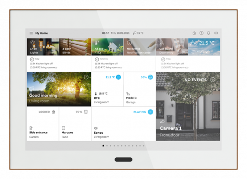 Свободно программируемая сенсорная панель с 10-дюймовым IPS-экраном с разрешением 1280*800, которая сочетает в себе автоматизацию умного дома и дверную связь в одном устройстве для жилых помещений, гостиниц и коммерческих зданий. SmartTouch 10 предлагает управление домом и мониторинг системы free@home или KNX, а также полностью интегрированные функции ABB Welcome®. Контролируйте, наблюдайте и управляйте всей вашей установкой на одном устройстве: переключение — затемнение — слайдер — шторка — элемент управления RGBW — пошаговый переключатель — переключатель сцены — элемент дисплея — элемент управления звуком. С функцией сцены, логическими функциями, симуляцией присутствия и временными программами. SmartTouch® 10” также можно использовать в качестве оконечного устройства для связи с вызывными станциями ABB-Welcome и в составе домофонной системы ABB-Welcome. Функции KNX: • В общей сложности 450 элементов управления отображаются максимум на 25 страницах. • 80 сообщений об ошибках и тревогах • 30 логических функций • 40 таймеров • имитация присутствия для 20 участников • 10 активаторов сцен • 3 объекта RTC • Оснащен слуховой петлей для передачи аудиосигнала в слуховые аппараты • Отображение страницы с максимум 18 касаниями поверхности на одной странице free@home: • Соединение по витой паре обеспечивает на одной странице до 18 элементов управления. • В качестве альтернативы, для дополнительного контроля, подключение через Wi-Fi обеспечивает тот же уровень контроля и функций, что и приложение free@home. Добро пожаловать: • Встроенный IP-шлюз • Возможность интеграции IP-камер ONVIF Внешний источник питания: 20–32 В постоянного тока (SELV) или через системный контроллер ABB-Welcome. Размер дисплея: 25,4 см (10 дюймов): Разрешение экрана: 1280*800: Экран дисплея: Дисплей IPS Размеры (Д х Ш х Г): (180,2 мм x 254,6 мм x 17,5 мм) Утопленный или настенный монтаж, крепление для рабочего стола Установка Плоская тонкая рама из настоящего металла почти вплотную прилегает к стене (14 мм) и доступна в 4 цветах (нержавеющая сталь, антрацит, золото и розовое золото) и черном или белом стекле.