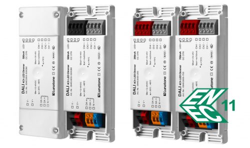 Светодиодный DALI-драйвер (CC) с 4 независимыми каналами. Каждый канал имеет свой собственный DALI-адрес. В качестве альтернативы управлению DT6 устройство также поддерживает режимы работы Colour&Dim (подходит для светильников RGB и RGBW) и SwitchDim2 (управление через 2 входа выключателя без DALI). Поставляется с входным напряжением от 12 до 48 В постоянного тока, выходным напряжением от 3 до 45 В и различными выходными токами до 500 мА/канал (общий плюсовой разъем) или 700 мА/канал (общий минусовой разъем).