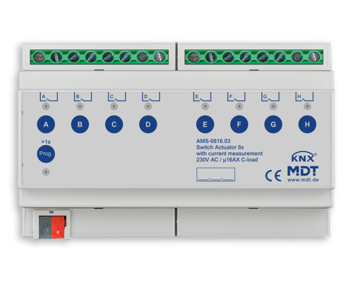 MDT AMS-0816.03 Актуатор переключателя 8-кратный, 8SU MDRC, 16 А, 230 В переменного тока, нагрузка С, стандарт, 140 мкФ, измерение тока