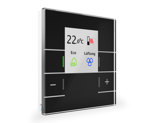 Активный цветной дисплей для индикации функций и состояния. Цвет фона с регулируемой яркостью и яркостью дисплея. Отображение заданной и фактической температуры. Для регулирования температуры в помещении. Диапазон от -10 до +50 °C. Выбираемый регулятор температуры (ПИ, двухпозиционный, ШИМ). Работа как комнатная. Возможен блок расширения температуры Простая настройка заданного значения с помощью отдельных кнопок +/- 1 бит +/-, 1 байт или 2 байта абсолютный объект для настройки заданного значения. Заданные значения сохраняются при сбое напряжения на шине. Предельные значения мин/макс, сигнализация защиты от замерзания, мин/макс. память Режим работы можно установить с помощью битовых/байтовых объектов. Управление вентиляцией вручную или в автоматическом режиме. 14-байтовый объект для текстовой диагностики. Рекомендуемая высота установки: 1,60 м. Размеры (Ш x В): 92 мм x 92 мм.