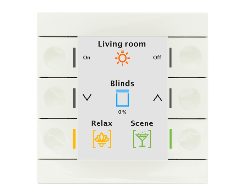 Выключатель Smart 86 имеет шесть механических кнопок с выемками для пальцев. С помощью кнопки можно назначить до 12 функций, а также функцию «шлепка». Кнопки помечены индивидуально с помощью символов и текста на большом активном цветном дисплее. Статус соответствующей функции можно определить как на дисплее, так и с помощью RGB-дисплея кнопок. Дисплей динамически подстраивается под окружающую яркость и может автоматически отключаться в ночное время. Вариант с датчиком температуры предлагает дополнительные функции для настройки температуры отопления или кондиционирования.