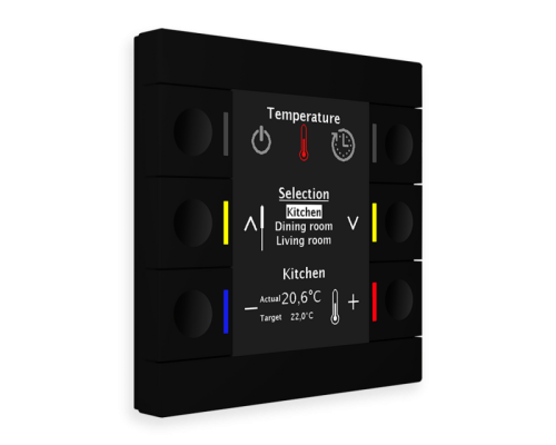 Большой активный цветной дисплей (автоматическая регулировка яркости) Четыре функции прямого управления (например, присутствие, освещение, жалюзи) 20 функций управления через меню / таймер (например, диммер / затвор / переключение / отправка) значения/сцены/заданные значения температуры) Кодовый замок с 4-6 цифрами для блокировки и разблокировки устройства или активации сигнализации Ежедневный/еженедельный/астрономический таймер (20 каналов каждый с 6 временами переключения) Функция отпуска с активацией периода времени Автоматический расчет праздничные дни Комфортный комнатный регулятор температуры с темп. датчик Управление вентиляцией (ручное или автоматическое) Визуализация внутренней/наружной температуры, заданного значения, времени/даты Визуализация информации/сообщений о состоянии (1 бит / 14 байт) 6 светодиодов состояния с независимым управлением 6 логических блоков каждый с 4 входами Дополнительный источник питания не требуется Установка в распределительной коробке. Рекомендуемая высота установки: 1,6 м. Размеры (Ш х В): 86 мм х 86 мм. Производство в Германии, сертифицировано по ISO 9001. Гарантия 3 года.