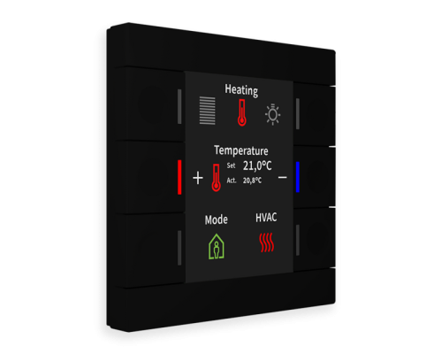 Кнопочный Smart 86 имеет шесть механических кнопок с выемками для пальцев. С помощью кнопки можно назначить до 12 функций, а также функцию «шлепка». Кнопки помечены индивидуально с помощью символов и текста на большом активном цветном дисплее. Статус соответствующей функции можно определить как на дисплее, так и с помощью RGB-дисплея кнопок. Дисплей динамически подстраивается под окружающую яркость и может автоматически отключаться в ночное время. Вариант с датчиком температуры предлагает дополнительные функции для настройки температуры отопления или кондиционирования воздуха.