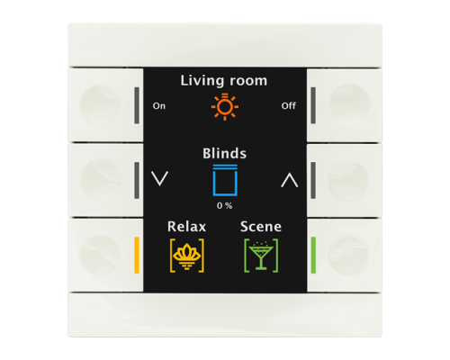 Кнопочный Smart 86 имеет шесть механических кнопок с выемками для пальцев. С помощью кнопки можно назначить до 12 функций, а также функцию «шлепка». Кнопки помечены индивидуально с помощью символов и текста на большом активном цветном дисплее. Статус соответствующей функции можно определить как на дисплее, так и с помощью RGB-дисплея кнопок. Дисплей динамически подстраивается под окружающую яркость и может автоматически отключаться в ночное время. Вариант с датчиком температуры предлагает дополнительные функции для настройки температуры отопления или кондиционирования воздуха.