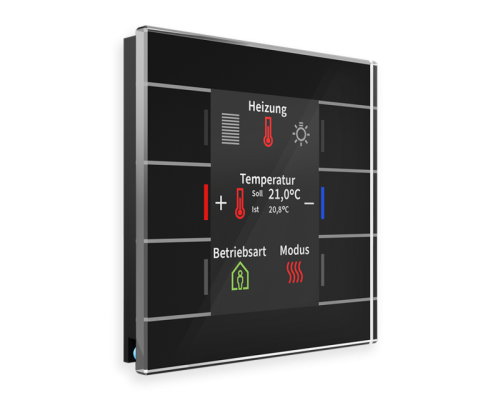 Новинка: изделия из черного стекла, теперь дополненные черной опорной пластиной. Кнопки можно запрограммировать для работы с 1 или 2 кнопками. До 12 функций на 2 или 3. уровни (функции 2x6 или 3x4) До 6 функций без переключения уровней Инновационное групповое управление с длительным/сверхдолгим нажатием клавиши Новая функция сопоставления для удобного распределения функций Большой активный цветной дисплей для индикации функции и состояния Регулируемый цвет фона дисплея (белый) или черный) Новые стандартные символы Символы и простой текст, настраиваемые для каждой кнопки/функции Индикация отдельных сообщений/текстовых телеграмм (1 бит / 14 байт) Применение в качестве часов реального времени в сочетании с активатором отопления AKH Управление 1 или 2 кнопками для переключения, затемнения, жалюзи , значения Короткое/длинное нажатие кнопки с двумя объектами Инновационное групповое управление с длительным/сверхдлительным нажатием/нажатием клавиши Новая функция сопоставления для удобного распределения функций Расширенный информационный дисплей с до 3 строк и до 6 измеренных значений Современные значки (загрузка значков) Функция шлепка с новым набором функций RGB-статус всех кнопок, управляемый отдельно с каждого уровня Индикация внутренней/наружной температуры и времени Автоматическая яркость дисплея с помощью датчика освещенности и дневного/ночного объекта Функция Slap с новым набором функций Рекомендуемая высота установки: 1,50-1,60 м ( в качестве кнопки) Установка в монтажную коробку Размеры (Ш x В): 92 мм x 92 мм Дополнительный источник питания не требуется С датчиком температуры для измерения температуры в помещении Дополнительные функции для установки температуры и режима работы Применение в качестве RTC в сочетании с нагревательным приводом AK