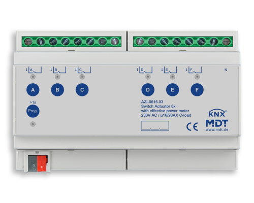 Промышленная версия переключателя MDT AZI с измерением активной мощности сочетает в себе коммутационную способность высоких пусковых токов с точностью измерения активной мощности. Возможно измерение тока по каждому каналу и измерение общего тока. Потребление энергии регистрируется встроенным счетчиком активной мощности. Привод оснащен бистабильными реле на ток до 16/20 А и нагрузку C до 200 мкФ.