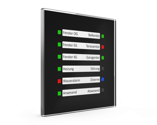 Стеклянный светодиодный индикатор MDT позволяет отображать универсальные логические и строительные функции. Могут отображаться три состояния (красное, зеленое, синее). Например, он идеально подходит для отображения состояния окон и дверей (зеленый = закрыто, красный = открыто).