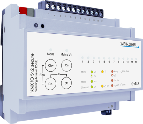 KNX IO 512secure - 12-кратный коммутационный приводКоммутационный привод KNX KNX IO 512secure предлагает 12 бистабильных релейных выходов, оптимизированных в первую очередь под требования светодиодных светильников. Однако можно коммутировать и другие нагрузки. Привод предлагает комплексные функции для универсальных выходов, включая сцены, задержку включения и выключения, переключение освещения лестниц и управление клапанами отопления (ШИМ для термоприводов). Кроме того, устройство предлагает независимые логические и временные функции.Устройство поддерживает защиту данных KNX.