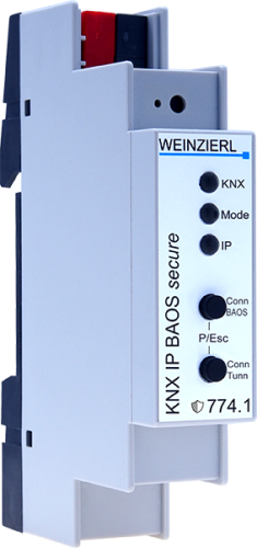 УстройствоKNX IP BAOS 774.1secureis используется в качестве интерфейса для подключения к KNX как на уровне телеграмм (KNXnet/IP Tunneling), так и на уровне точек данных (KNX Application Layer). Клиенты могут напрямую получать доступ к групповым объектам через TCP/IP по бинарному протоколу. Устройство сконфигурировано с ETS и поддерживает до 1000 групповых объектов. Поддерживается 10 одновременных клиентских соединений по протоколу BAOS. BAOS - это аббревиатура от "Bus Access and Object Server". Возможно повсеместное подключение к шине KNX через локальную сеть. Также возможно подключение к шине через Интернет с помощью KNX IP BAOS 774.1secure.Кнопки предназначены для диагностики. Светодиодные индикаторы отображают рабочее состояние и ошибки связи на шине.Питание подается через шину KNX. Устройство поддерживаетKNX SecurityиBAOS Security.