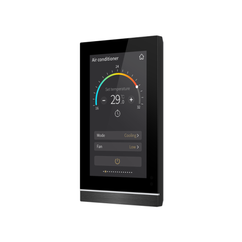 Возможности установки пароля и выбора заставки. Управление светом, шторами, HVAC и другими функциями KNX. Встроенный датчик температуры. Монтаж вертикальный или горизонтальный в стандартный европейский подрозетник 60 мм. Цвет: чёрный.