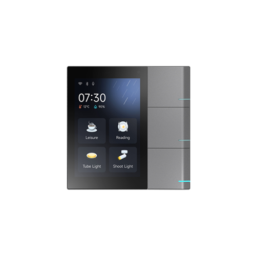 Интегрирует системы автоматизации и видеодомофонии. Дизайн соединяет сенсорный экран 3,3" и 3 физических клавиши. Разрешение 480*320. Экран поддерживает функцию multi-touch. Световая индикация клавиш меняет яркость в зависимости от активации/ дезактивации. Управление светом, шторами, HVAC, сценариями и другими функциями KNX. Поддерживает дистанционное управление, в т.ч. через приложение. CPU: Dual-core ARM Cortex-A7. Монтаж в коробку: встраиваемый - 60 мм, накладной - 86 мм