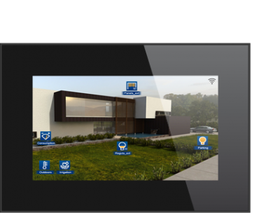Имеет 16 страниц для размещения значков, 3D-чертежей, графиков, изображений и т.д. Возможно контролировать элементы установки с помощью 3D-чертежей. Интуитивное программирование сценариев и годовых событий. Возможность включения/выключения будильника, активации симуляции присутствия, проверки прогноза погоды, использования в качестве графической доски и т.д.