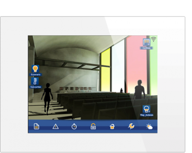 Имеет 16 страниц для размещения значков, 3D-чертежей, графиков, изображений и т.д. Возможно контролировать элементы установки с помощью 3D-чертежей. Интуитивное программирование сценариев и годовых событий. Возможность включения/выключения будильника, активации симуляции присутствия, проверки прогноза погоды, использования в качестве графической доски и т.д.