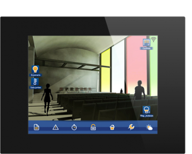 Имеет 16 страниц для размещения значков, 3D-чертежей, графиков, изображений и т.д. Возможно контролировать элементы установки с помощью 3D-чертежей. Интуитивное программирование сценариев и годовых событий. Возможность включения/выключения будильника, активации симуляции присутствия, проверки прогноза погоды, использования в качестве графической доски и т.д.
