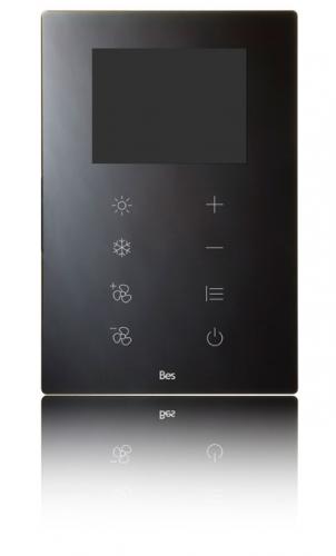 KNX вертикальный термостат с большими сенсорными зонами и встроенным 2.8” экраном для управления независимыми климатическими зонами: управление скоростью, режимы, измерение температуры, установка необходимой температуры и т.д.