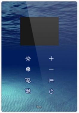 KNX вертикальный термостат с большими сенсорными зонами и встроенным 2.8” экраном для управления независимыми климатическими зонами: управление скоростью, режимы, измерение температуры, установка необходимой температуры и т.д.