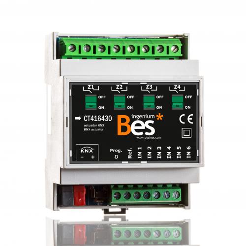 Вкл/выкл актуатор с 4 выходами, реле свободного напряжения. Многофункциональное программирование. Выходы работают одновременно или независимо в разных режимах (двоичные выходы, жалюзи, фанкойл и т.д.). Устройство имеет 6 низковольтных цифровых входов для подключения обычных кнопок или переключателей. Арифметико-логическое устройство.