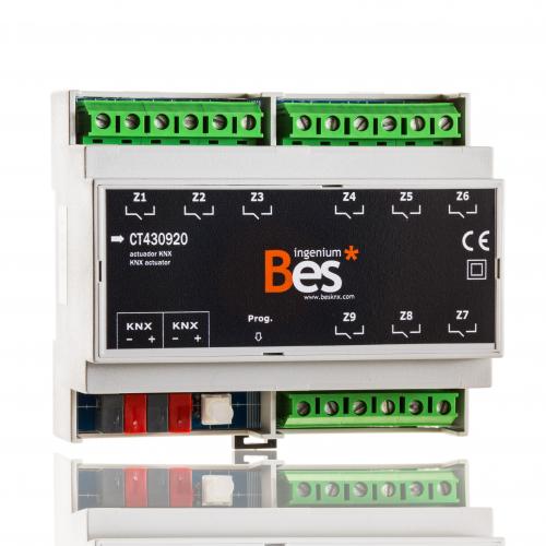 Вкл/выкл актуатор с 9 выходами, реле свободного напряжения с мощностью 16A при 230В на каждый выход. Многофункциональное программирование. Выходы работают одновременно или независимо в разных режимах (двоичные выходы, жалюзи, фанкойл и т.д.). Арифметико-логическое устройство. PARAM: Programming by ETS parameter application.