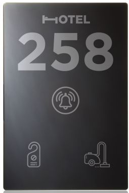 Устройство с индикаторами MUR/DND для гостиничных номеров. Включает в себя две опции - "Не беспокоить" и "Убраться в комнате". Также имеется индикатор кнопки дверного звонка и номера комнаты.