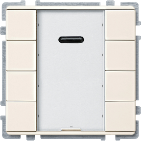 Со встроенным шинным соединителем. Кнопочный выключатель с 8 кнопками управления, индикатором рабочего состояния, 8 управляемыми по отдельности синими индикаторами и полем для надписи. <br>