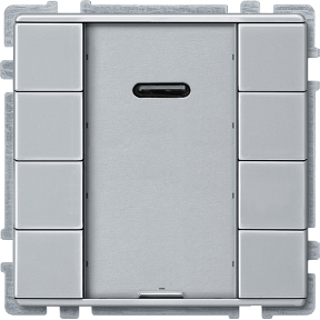 Со встроенным шинным соединителем. Кнопочный выключатель с 8 кнопками управления, индикатором рабочего состояния, 8 управляемыми по отдельности синими индикаторами и полем для надписи. <br>