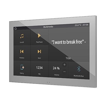 Емкостная сенсорная панель с 10-дюймовым ЖК-дисплеем, отображающим 16 миллионов цветов, и разрешением 1280×800 пикселей для комплексного управления домом, гостиничным номером или любым другим видом установки благодаря 12 полностью настраиваемым страницам в соответствии с неподвластной времени и минималистской эстетикой. Он включает в себя датчик внешней освещенности для автоматической регулировки яркости, а также датчик приближения для быстрого запуска при обнаружении активности, который также может запускать настроенную заставку. Кроме того, он включает в себя 2 термостата и 4 аналого-цифровых входа. Он имеет порты USB и Ethernet для обновления программы. Установка в двойную заднюю коробку европейского/британского стандарта.
