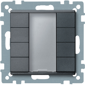 Со встроенным шинным соединителем. Кнопочный выключатель с 8 кнопками управления, индикатором рабочего состояния и полем для надписи. Индикатор рабочего состояния можно использовать также в качестве подсветки для ориентации. Устройство соединяется с линией шины через соединительную клемму шины.