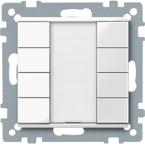 Со встроенным шинным соединителем. Кнопочный выключатель с 8 кнопками управления, индикатором рабочего состояния и полем для надписи. Индикатор рабочего состояния можно использовать также в качестве подсветки для ориентации. Устройство соединяется с линией шины через соединительную клемму шины.