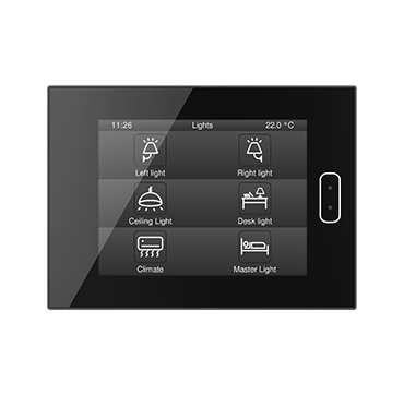 Емкостная сенсорная панель с 4,1-дюймовым дисплеем с подсветкой, датчиком приближения, внутренним датчиком температуры и двумя независимыми термостатами. 56 точек/кнопок управления, разделенных на 7 страниц. Встроенный датчик приближения обеспечивает отображение заставки (изображение, время, дата и/или температура), когда сенсорная панель не используется, а датчик освещенности автоматически регулирует яркость. Включены 4 аналого-цифровых входа, которые можно настроить как двоичные входы, датчики, кнопки, датчики температуры или детекторы движения.