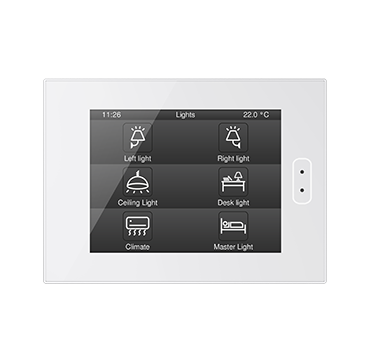 Емкостная сенсорная панель с 4,1-дюймовым дисплеем с подсветкой, датчиком приближения, внутренним датчиком температуры и двумя независимыми термостатами. 56 точек/кнопок управления, разделенных на 7 страниц. Встроенный датчик приближения обеспечивает отображение заставки (изображение, время, дата и/или температура), когда сенсорная панель не используется, а датчик освещенности автоматически регулирует яркость. Включены 4 аналого-цифровых входа, которые можно настроить как двоичные входы, датчики, кнопки, датчики температуры или детекторы движения.