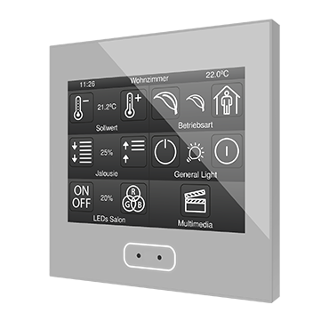 Емкостная сенсорная панель с 3,5-дюймовым дисплеем с подсветкой, датчик приближения, внутренний датчик температуры, внутренний датчик влажности и термостаты для двух независимых зон. Он может содержать до 56 элементов управления/индикаторов, распределенных на 7 страницах с меню навигации. Заставка с датой, временем и/или температурой устанавливается, когда сенсорная панель не используется, а меню отображается автоматически при приближении пользователя благодаря датчику приближения. Его яркость регулируется встроенным датчиком освещенности. Кроме того, он имеет 4 аналого-цифровых входа, которые можно настроить как бинарные входы для датчиков и беспотенциальных кнопок, как входы датчиков температуры или как входы датчиков движения. Доступен в белом, антрацитовом, серебристом и глянцево-белом цветах. Аксессуары: датчик температуры, датчик движения.