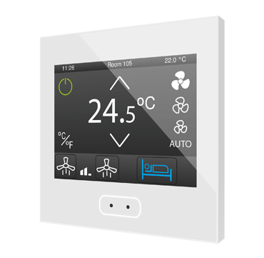 Емкостная сенсорная панель с 3,5-дюймовым дисплеем с подсветкой, датчик приближения, внутренний датчик температуры, внутренний датчик влажности и термостаты для двух независимых зон. Он может содержать до 56 элементов управления/индикаторов, распределенных на 7 страницах с меню навигации. Заставка с датой, временем и/или температурой устанавливается, когда сенсорная панель не используется, а меню отображается автоматически при приближении пользователя благодаря датчику приближения. Его яркость регулируется встроенным датчиком освещенности. Кроме того, он имеет 4 аналого-цифровых входа, которые можно настроить как бинарные входы для датчиков и беспотенциальных кнопок, как входы датчиков температуры или как входы датчиков движения. Доступен в белом, антрацитовом, серебристом и глянцево-белом цветах. Аксессуары: датчик температуры, датчик движения.